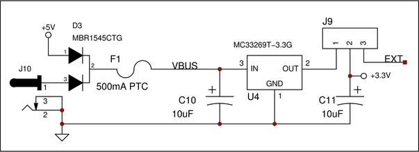 pin one of J9. The input of the uC board circuitry is connected to pin