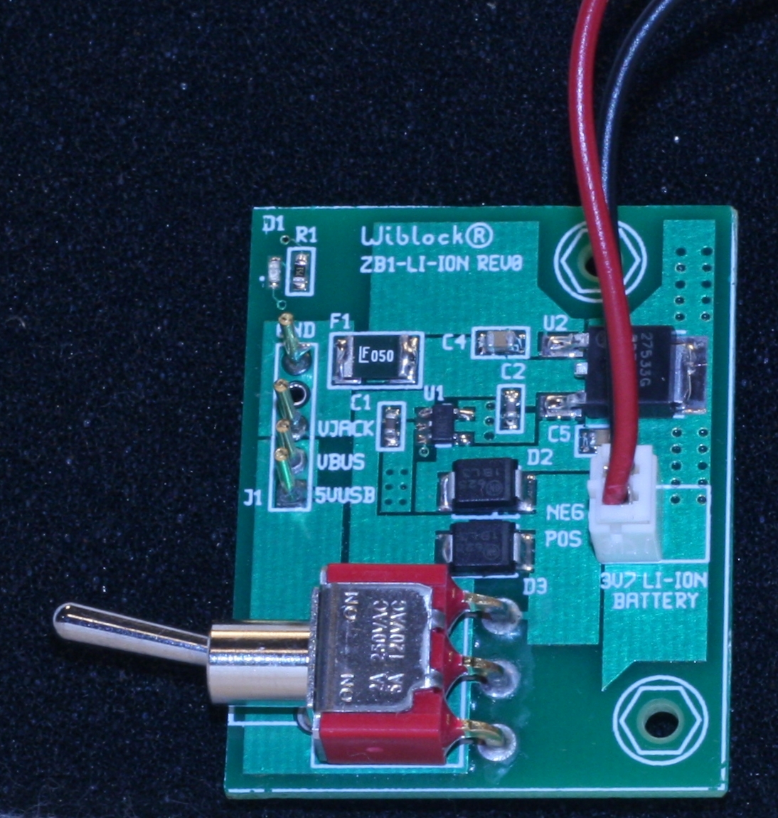 The ZB1-LI-ION design is a Li-ion battery chargers that is compatible with the ZB1, NB1 and NB1A. Each charger outputs a regulated 3.3VDC using either the battery, USB port or the wall adapter.The USB port and wall adapter are diode or'ed onto the input voltage bus (VBUS). The three position toggle switch connects the input of the 3.3V LDO to either the battery or VBUS. The OFF position is in the center. The output of the 3.3V LDO connects to the external voltage input connector of the microcontroller board.
